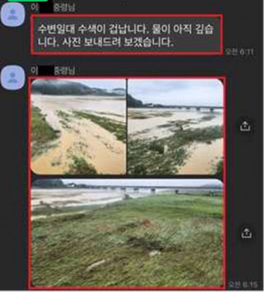 06:11 포7대대장 "수변일대 수색이 겁납니다. 물이 아직 깊습니다"라며 사진들을 전송한다.