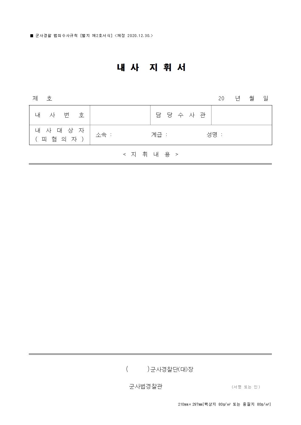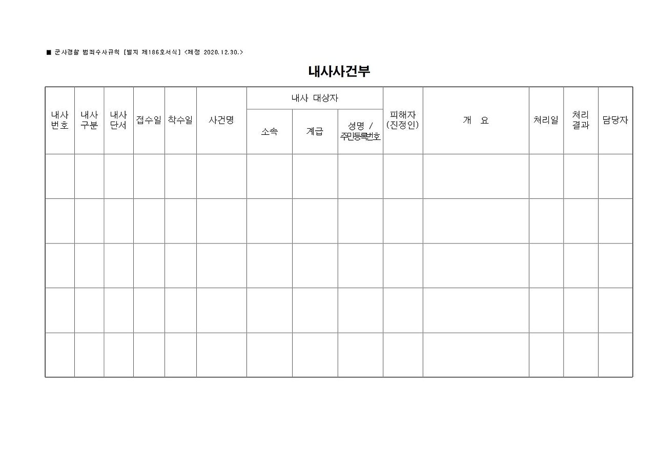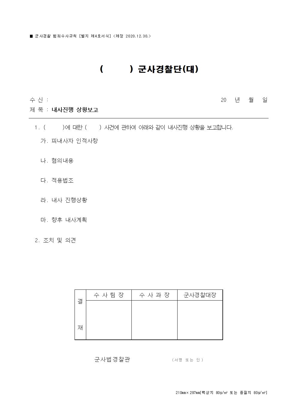 입건전 조사를 하려면 소속부대의 장에게 보고해서 지휘를 받아야 한다. 입건전조사 관련 양식이 없으므로 군사경찰범죄수사규칙 제25조(수사서류의 작성) ① 군사법경찰관이 범죄수사에 사용하는 ... 없는 수사서류는 「군검찰 사건사무규칙」,「(경찰청) 범죄수사규칙」의 서식을 준용하여 사용할 수 있다. 규정에 의거, 다음의 서식을 사용한다.