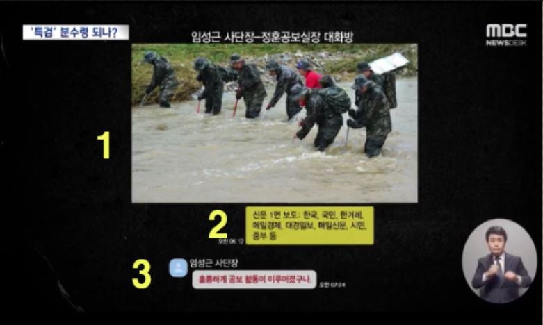 맨 위의 큰 이미지는 그대로 민주당 의원들이 청문회장에 가지고 나와서 증인으로 소환된 임성근사단장을 곤혹스럽게 만든 그 이미지다. 출처는 MBC와 한겨레가 주를 이룬다.