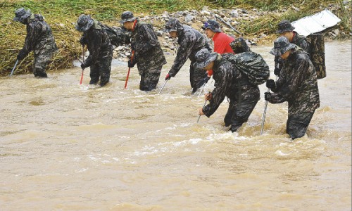 해병대 1사단 제3포병대대 장병들이 18일 산사태로 여러 명이 실종된 경북 예천군 감천면 벌방교회 앞 하천에서 수색작업을 하고 있다. 뉴시스