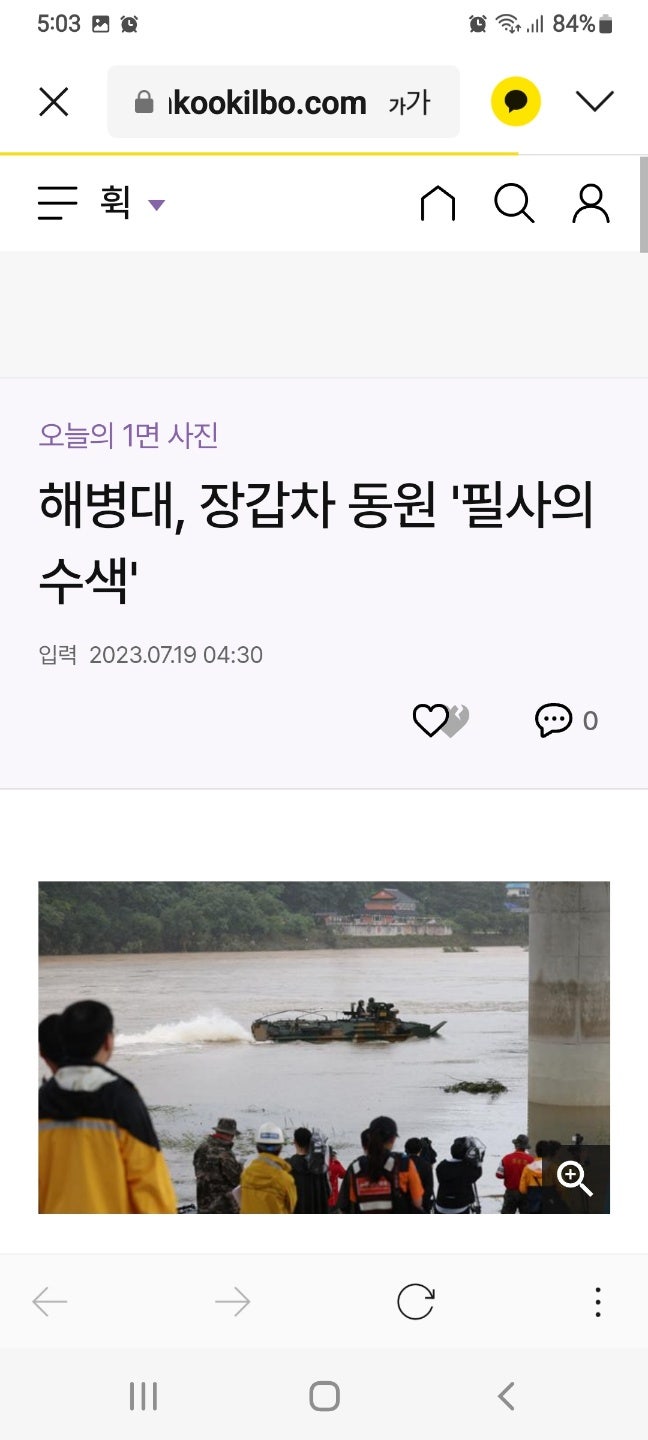 [오늘의 1면 사진] 해병대, 장갑차 동원 '필사의 수색'(한국)