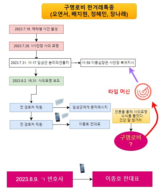 그 후인 2023.8.9 ㄱ변호사와 이종호와의 통화에서 ㄱ변호사가 해병대1사단을 화제로 끄집어내 거론하자 이종호가 사표내지 말라고 전하라 했다며 로비하겠다고 허세떠는 맥락의 대화이다. 그런데 맨 마지막에 뜬금없이 ㄱ변호사는 여태 대화내용과는 어긋나게 VIP가 지켜주려고 했냐고 묻는다.