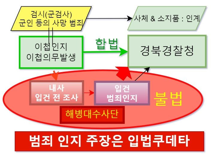 적법하게 처리됐더라면 바로 이 검시처분과정에서 의무적으로 통보하도록 돼 있는 검사나 사법경찰관에게 사건을 인계해야 했었다. 법원이 재판권을 가지는 군인 등의 범죄에 대한 수사절차 등에 관한 규정 제10조