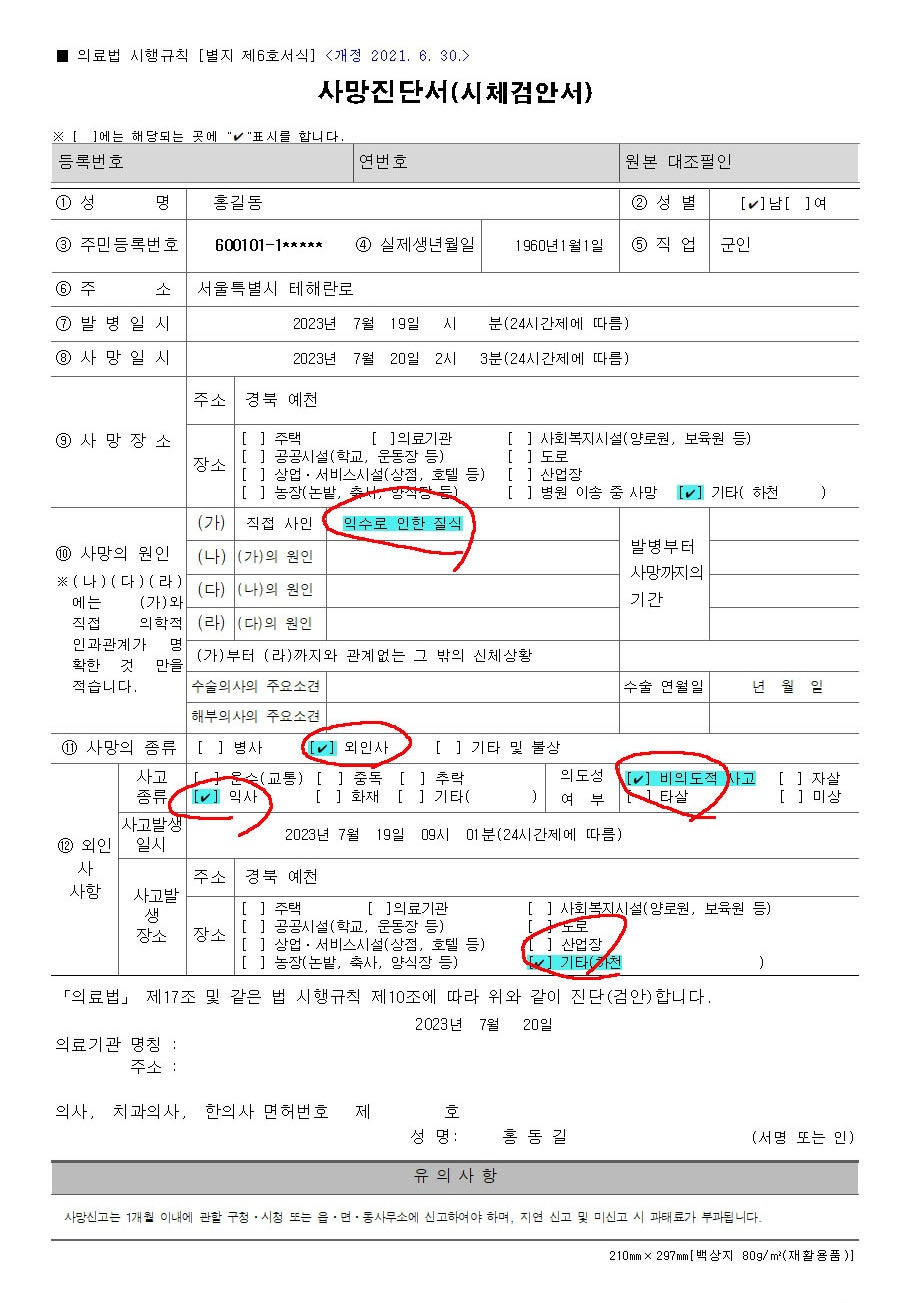 그래서 검시주체인 군검사가 박정훈팀에게 검시를 명하면 검시처분과정에서 (군)의사가 작성한 검안서를 봤을 것이고 또한 검안서와 촬영한 사진, 변사자의 가족, 친족, 이웃, 관계자 등의 진술조서를 작성했을 때는 이것들을 첨부, 작성한 검시조서를 주고받는 과정에서 필수로 사망원인이 범죄로 인한 것임을 인지할 수 밖에 없다.
