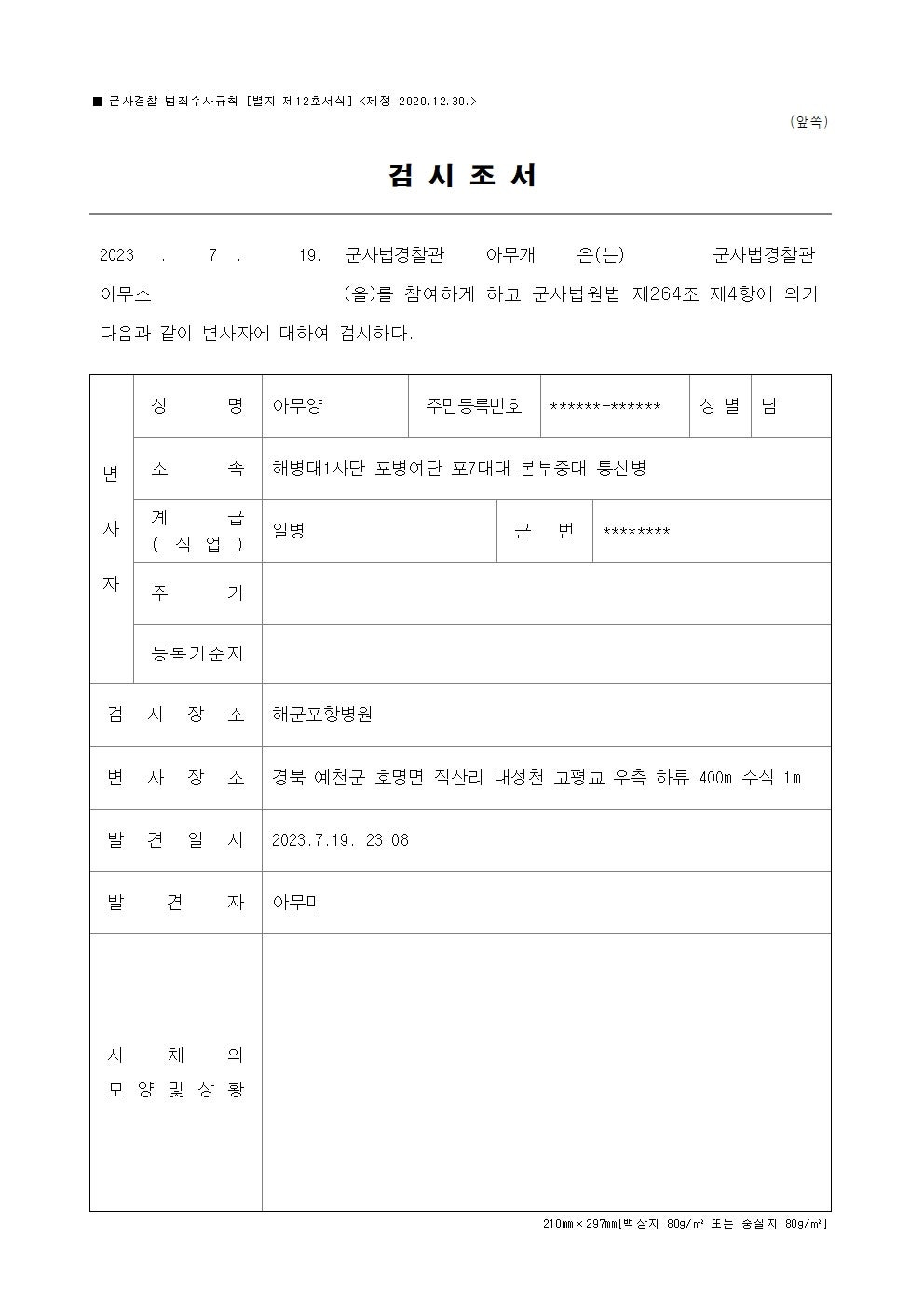 사건 접수, 인지 - > 군검사에게 변사사건 보고 및 지휘 품신 -> 군검찰에서 접수 및 할당(군검사) -> 검시주체인 군검사가 검시하든가 위임하든가 -> 박정훈팀이 위임받은 경우 검시 ->