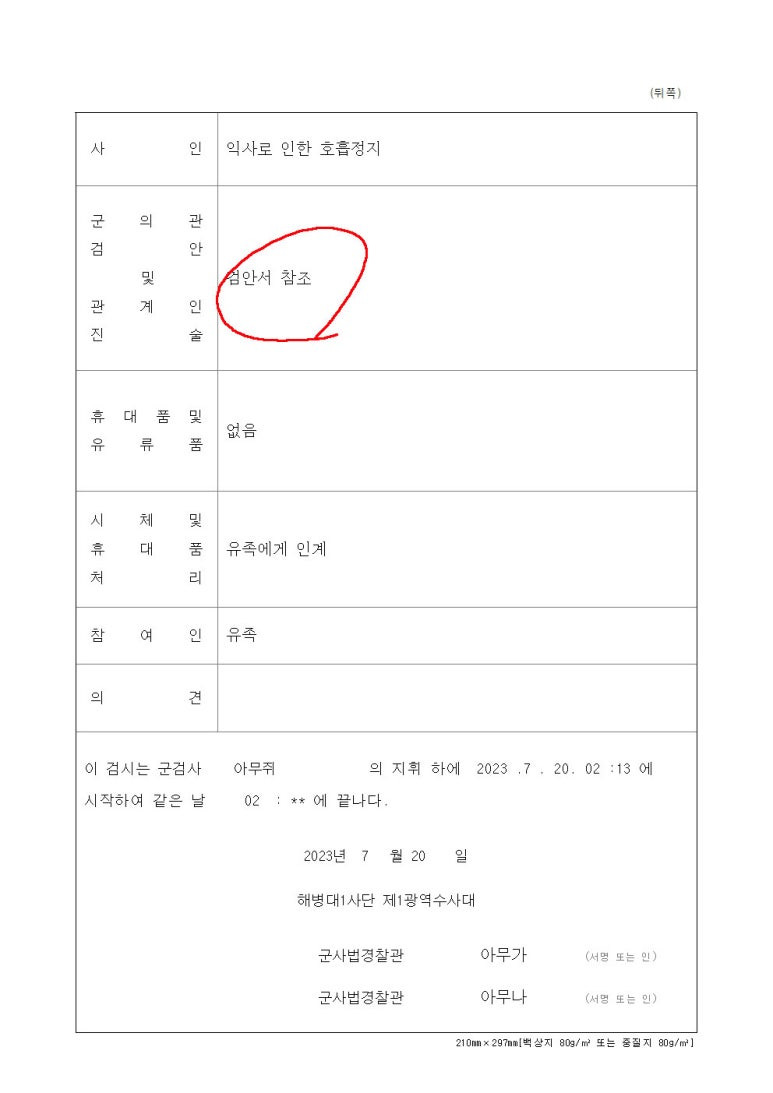 검시조서 작성주체인 군검사 혹은 군사법경찰이 조서 작성과정에서 이 검안서 또는 사망진단서를 첨부하게끔 의무화 돼 있다.