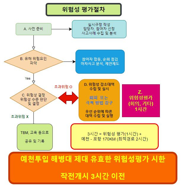 예를 들면 위험성 평가만 제대로 했더라면 위 이미지상의 C.단계에서 작전을 전개하려면 C-D간의 피드백과 피드간의 소통과정에서 초과위험이 있으면 궁극적으로 해결되기 전엔 아랫단계로 진입할 수 없다.