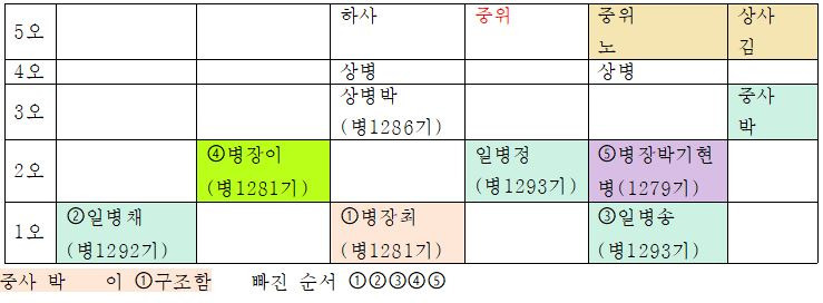 ①최병장, ② 채상병 ③송일병 ④이 병장 ⑤ 박병장 순이 해병대수사단 일러스트 내용이다.