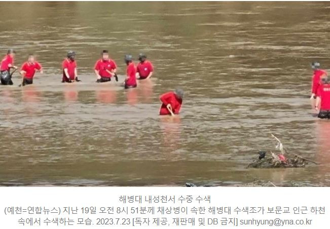 “간부들이 붙어 다니지 말고 간격을 두고 수색하라고 했다. 인원이 많은 상황에서 간격을 벌리다 보니 자연스레 가장 끝에 있던 해병들은 물살이 세고 깊어질 수밖에 없었다. 하지만 포7대대장, 포11대대장 지시 사항으로 ‘허리까지는 상관없다’라는 말과 중대장이 전날 밤 ‘총원 허리까지 들어가야 한다’고 한 카톡이 생각나서 별로 위험하지 않다고 생각하며 걸었다.”