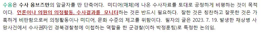 채상병 사병이나 군인 등의 사망사건에서 군수사단은 검시처분말고는 수사권이 배제되어 없다. 주권자인 국민들은 이걸 설명하면 제대로 이해하기 어려울 것이다.
