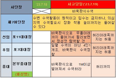 20230718,18:11 "개개인의 경계구역을 나누고 4인1개조로 책임주고 찔러가면서 확인할 것(1열로 비효율적으로 하는 부대장이 없도록 바둑판색 수색정찰을 실시할 것)"